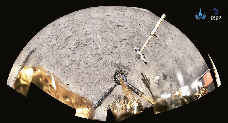 2020年12月4日,國家航天局公布了探月工程嫦娥五號(hào)探測器在月球表面國旗展示的照片。嫦娥五號(hào)著陸器和上升器組合體全景相機(jī)環(huán)拍成像,五星紅旗在月面成功展開,此外圖像上方可見已完成表取采樣的機(jī)械臂及采樣器。 新華社發(fā)(國家航天局供圖)