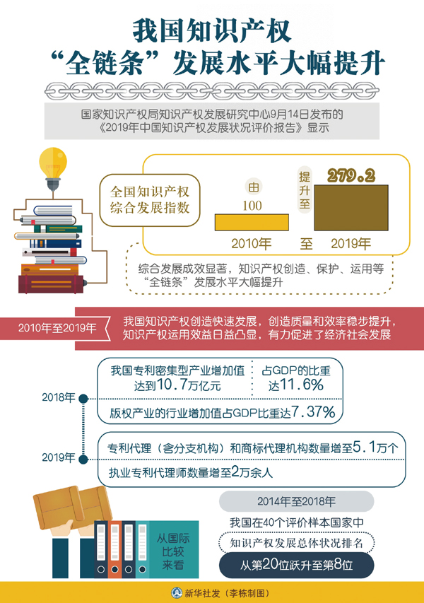 科技創(chuàng)新的時(shí)代大潮奔騰不息。除了高鐵這張響亮的名片,我國在信息通信、航空航天、核能等領(lǐng)域也已形成一批擁有自主知識(shí)產(chǎn)權(quán)的核心技術(shù),一次又一次刷新著我國高科技領(lǐng)域知識(shí)產(chǎn)權(quán)的紀(jì)錄。2020年底,世界知識(shí)產(chǎn)權(quán)組織發(fā)布的《2020年全球創(chuàng)新指數(shù)》報(bào)告顯示,在全球131個(gè)經(jīng)濟(jì)體中,中國的創(chuàng)新能力持續(xù)位居世界前15行列,是躋身綜合排名前30位的唯一中等收入經(jīng)濟(jì)體。我國商標(biāo)申請(qǐng)量、發(fā)明專利申請(qǐng)量連續(xù)多年位居世界首位;我國著作權(quán)產(chǎn)業(yè)在國民經(jīng)濟(jì)中的比重連年提升,2019年達(dá)到7.39%。